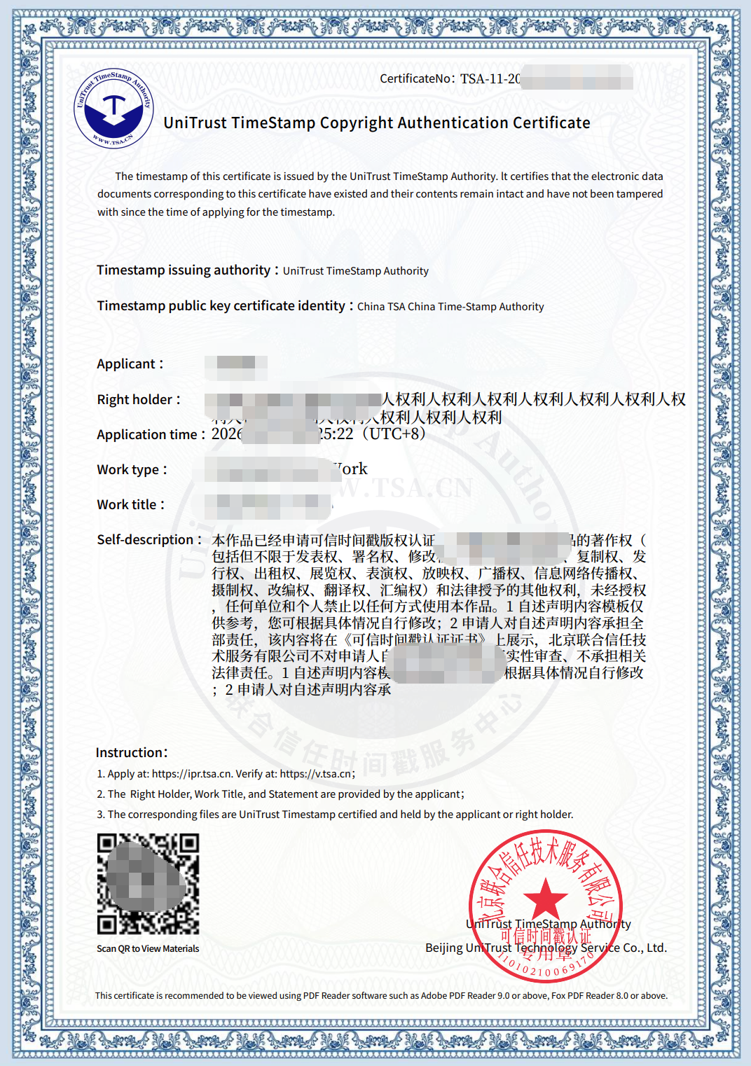 ① 本证书申请地址:https://ipr.tsa.cn,验证地址:https://v.tsa.cn;